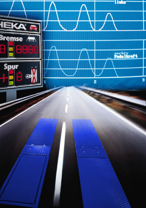 HEKA Prüfstrasse: komfortable, Reifen und Felgen schonende Prüfung. Logische Strassengleiche Prüfschritte. Ökonomisch nur 1/100 Strombedarf als herkömmliche Prüfstände.