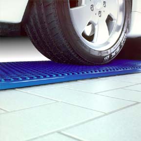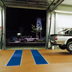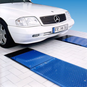 1979 Unsere weiterentwickelte HEKA Prüfstrasse im eigenen KFZ- Servicebetrieb. Mitten in der Werkstatt-Einfahrt in jeder Richtung zu überfahren. Hydraulischer Bremsenprüfstand. Damalige Bauhöhe überflur schon 4cm, einfachste Montage auf den Boden.